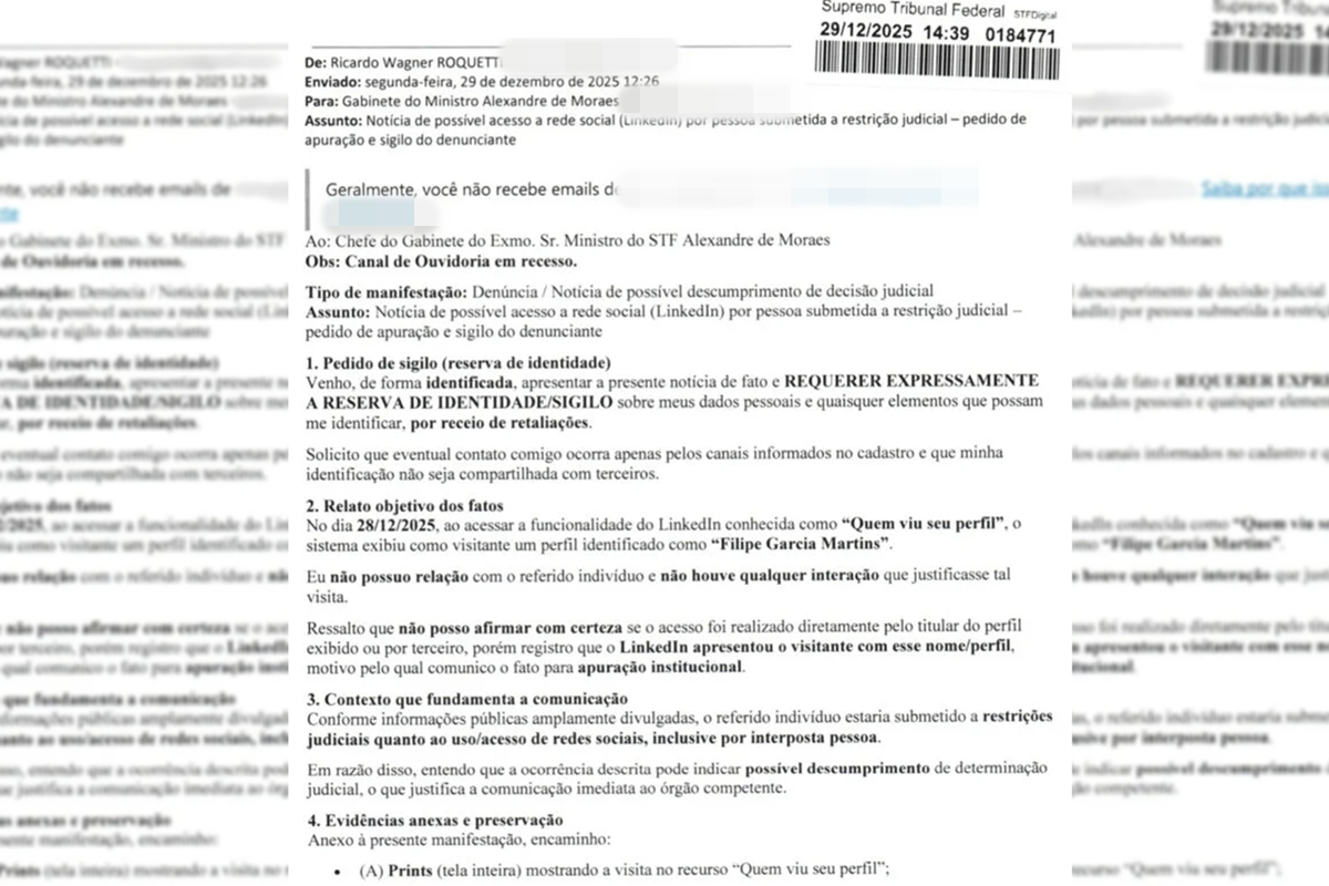 A denúncia formalizada por Ricardo Roquetti baseou-se em um mecanismo de notificação da rede social LinkedIn. No dia 29 de dezembro, o coronel enviou uma mensagem eletrônica diretamente ao gabinete de Alexandre de Moraes, relatando um fato incomum: o sistema da plataforma havia identificado o perfil verificado de Filipe Martins como visitante de sua página pessoal.