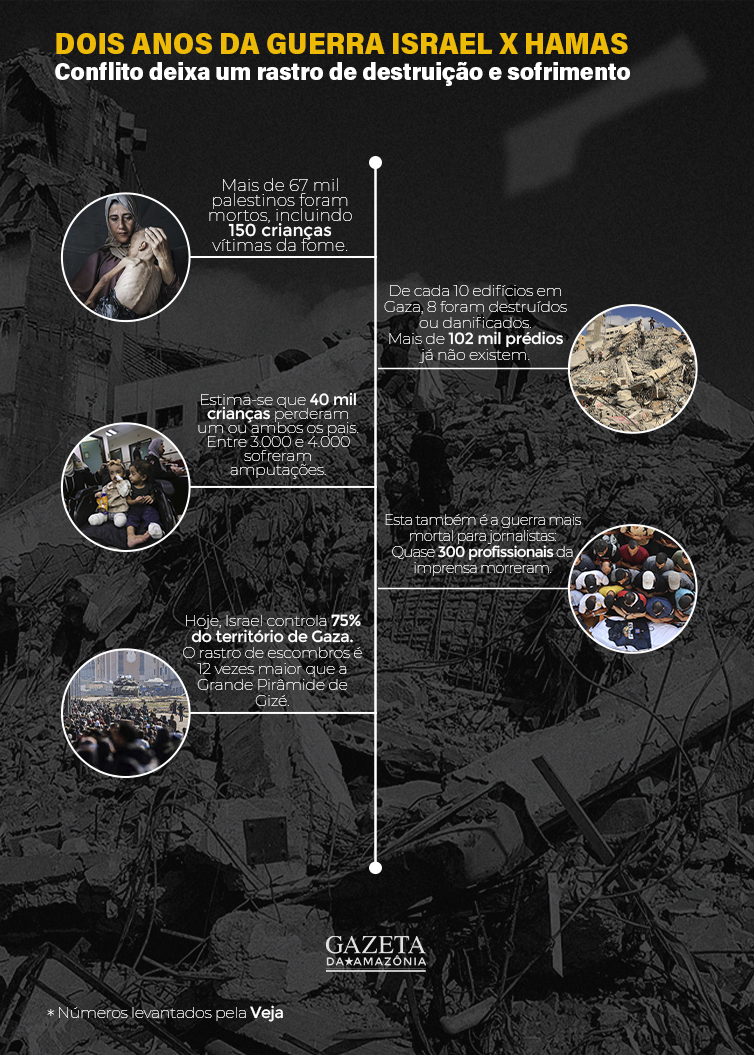 A guerra em Gaza completa dois anos nesta terça-feira (7), deixando um rastro de destruição sem precedentes. Desde o início do conflito, mais de 67 mil pessoas foram mortas, quase 170 mil ficaram feridas e grande parte da Faixa de Gaza foi reduzida a escombros.