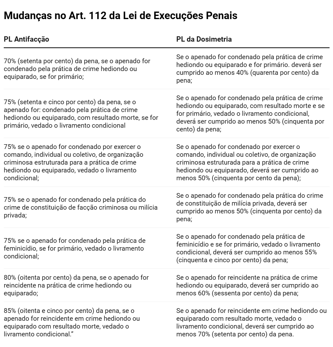 A confusão legislativa gerada pelo Projeto da Dosimetria cria um cenário onde a punição para crimes hediondos se torna mais leve do que a proposta original de combate ao crime organizado. Enquanto a Lei Antifacção exigia o cumprimento de 70% da pena para condenados primários por crimes hediondos ou equiparados progredirem de regime, o novo projeto mantém os atuais 40% (dois quintos).