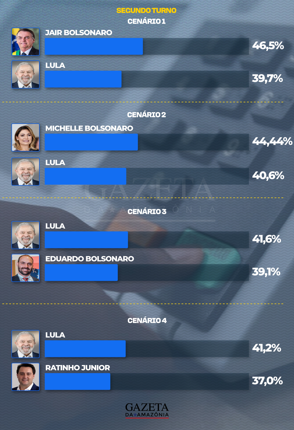 Outra opção levantada na pesquisa foi uma disputa presidencial entre Lula e Eduardo Bolsonaro que também aparecem empatados tecnicamente com 41,6% contra 39,1% respectivamente.