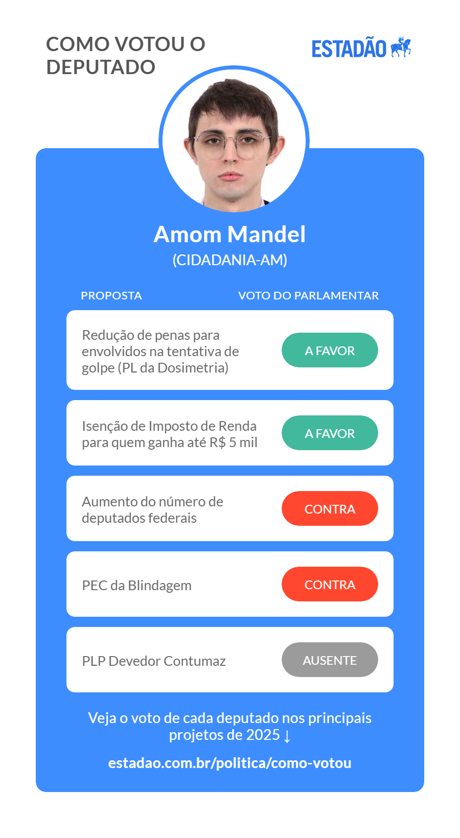 Por outro lado, o registro aponta ausências em votações importantes para parlamentares como Silas Câmara (ausente em 3 das 5 votações listadas) e Amom Mandel (ausente no PLP do Devedor Contumaz).